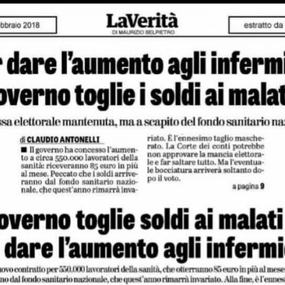 “Per dare l’aumento agli infermieri il governo toglie i soldi ai malati” è questo il titolo di un articolo apparso oggi sulla testata “LaVerità” di Maurizio Belpietro. Sconcertante ramificazione strum…